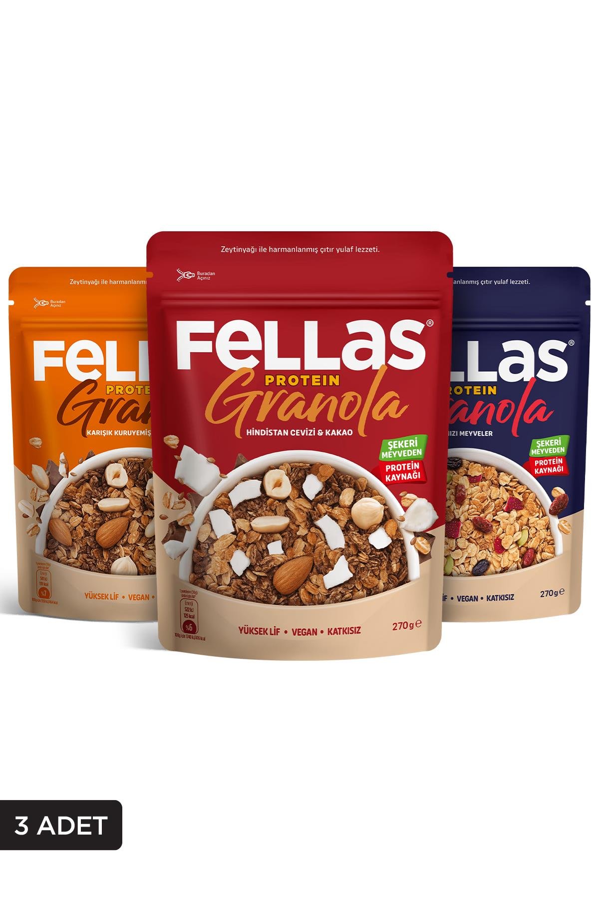 Fellas Protein Granola 3lü Mix Paket – Hindistan Cevizi 270g + Kırmızı Meyveler 270g + Karışık Kuruyemişli 270g